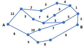 Задача 3. Города в магической стране связаны между собой линиями телепортации. Схема самих линий, а также стоимость перемещения по каждой из них в рублях указана на рисунке. В городе A расположена резиденция верховного мага, а его рабочий кабинет – в Академии Высокого Волшебства в городе В. Помогите верховному магу выбрать наиболее экономичный маршрут для перемещения из резиденции на работу. В ответ запишите стоимость найденного маршрута (в рублях).