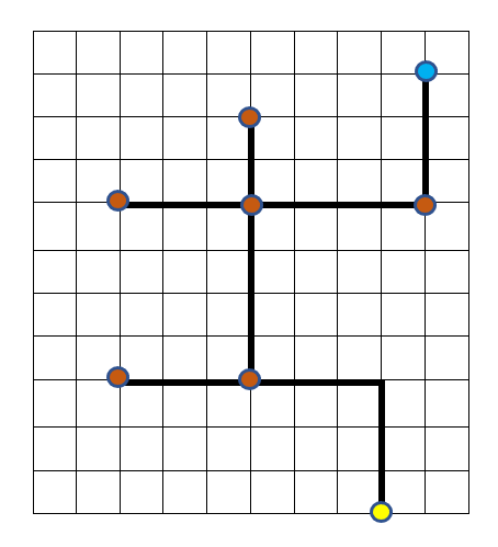 Задача 3. Оператор должен запрограммировать робота так, чтобы он, двигаясь по черным линиям, из синей точки клетчатой доски попал в желтую и при этом посетил все красные точки (см. рис). Роботу разрешено отдавать следующие команды: «1» - робот двигается 1 клетку вправо; «2» - робот двигается 1 клетку влево; «3» - робот двигается 1 клетку вверх; «4» - робот двигается 1 клетку вниз. Известно также, что изменение направления движения требует перенастройки робота, поэтому оператор хочет, чтобы таких переключений между режимами движения было как можно меньше. За какое наименьшее количество переключений режимов движения оператор сможет доставить робота из синей точки в желтую? (Замечание: последовательность команд «111221133» содержит 3 переключения: с 1 на 2, с 2 на 1 и с 1 на 3.)