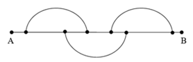 Задача 4. Сколько разных путей ведут из точки А в точку В (см. рисунок), если ни через какую точку пути нельзя проходить дважды? (На рисунке изображен отрезок АВ и три полуокружности.)
